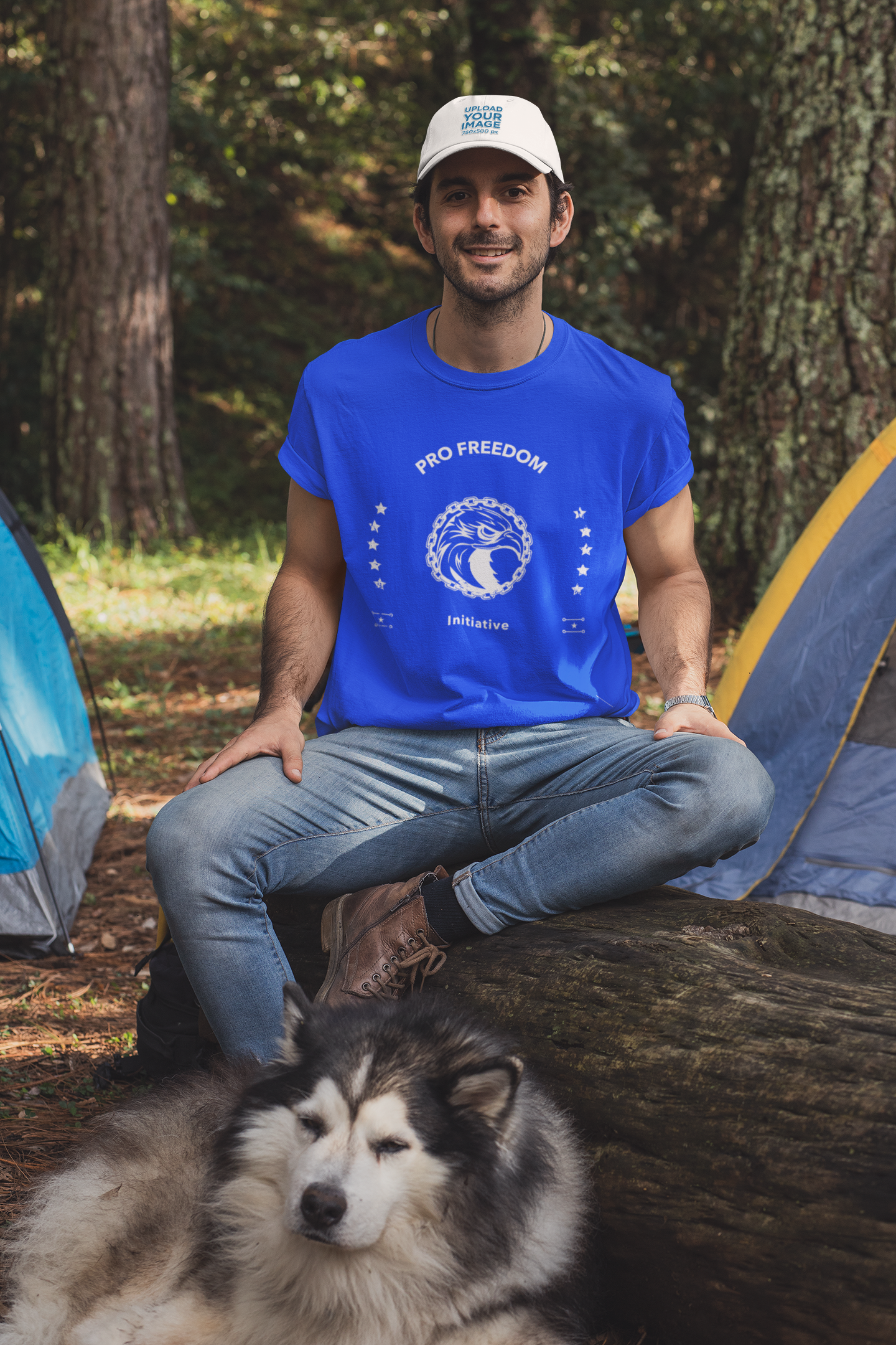 t-shirt-and-dad-hat-mockup-of-a-man-at-a-camping-site-with-his-dog-30475